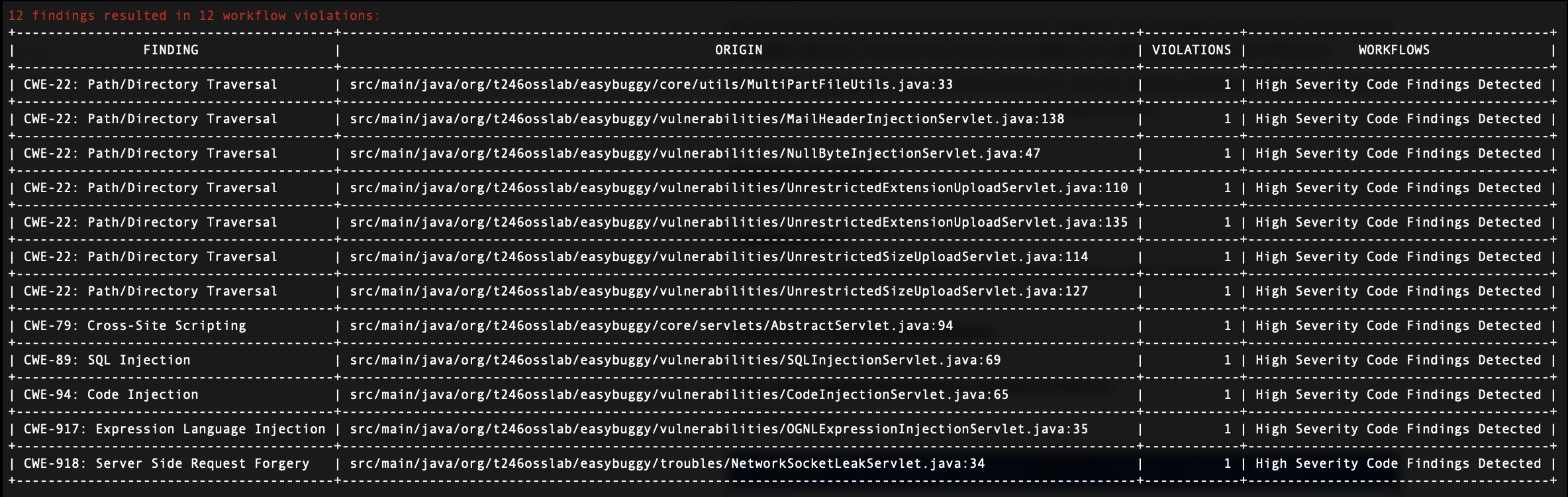 If the Mend CLI SAST scan scope falls under your workflow created in the Mend Platform Application, the Mend CLI will print out any violations found in the terminal. The information will be separated into 2 tables, as you can see in the following example: