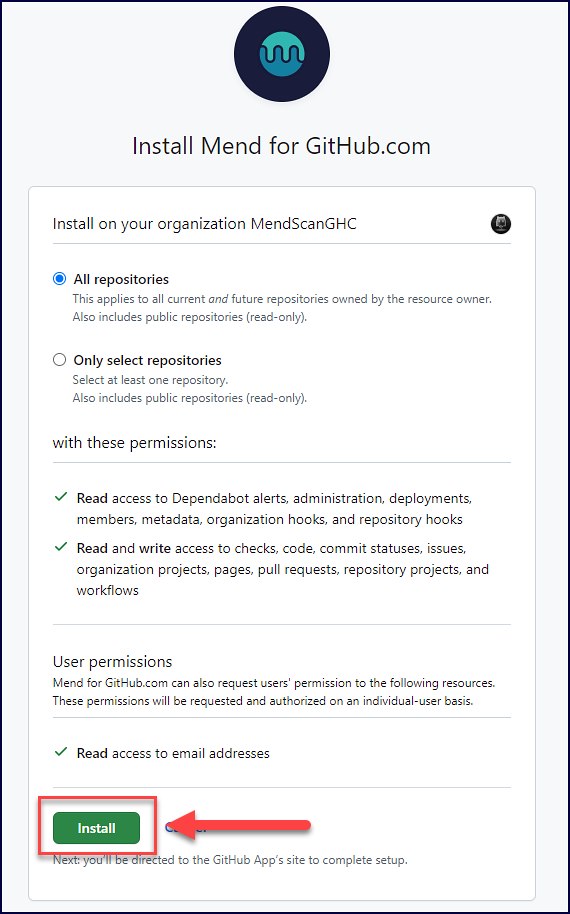 You must have administrator permissions to your GitHub account and to the relevant repositories (owner credentials) to install the Mend for GitHub.com app.