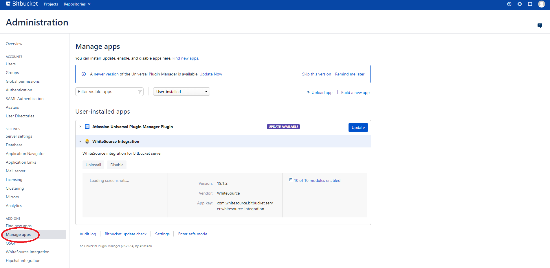 Go to the 'Administration’ page of your Bitbucket Data Center interface, and click on ‘Manage apps’ of the Add Ons section.