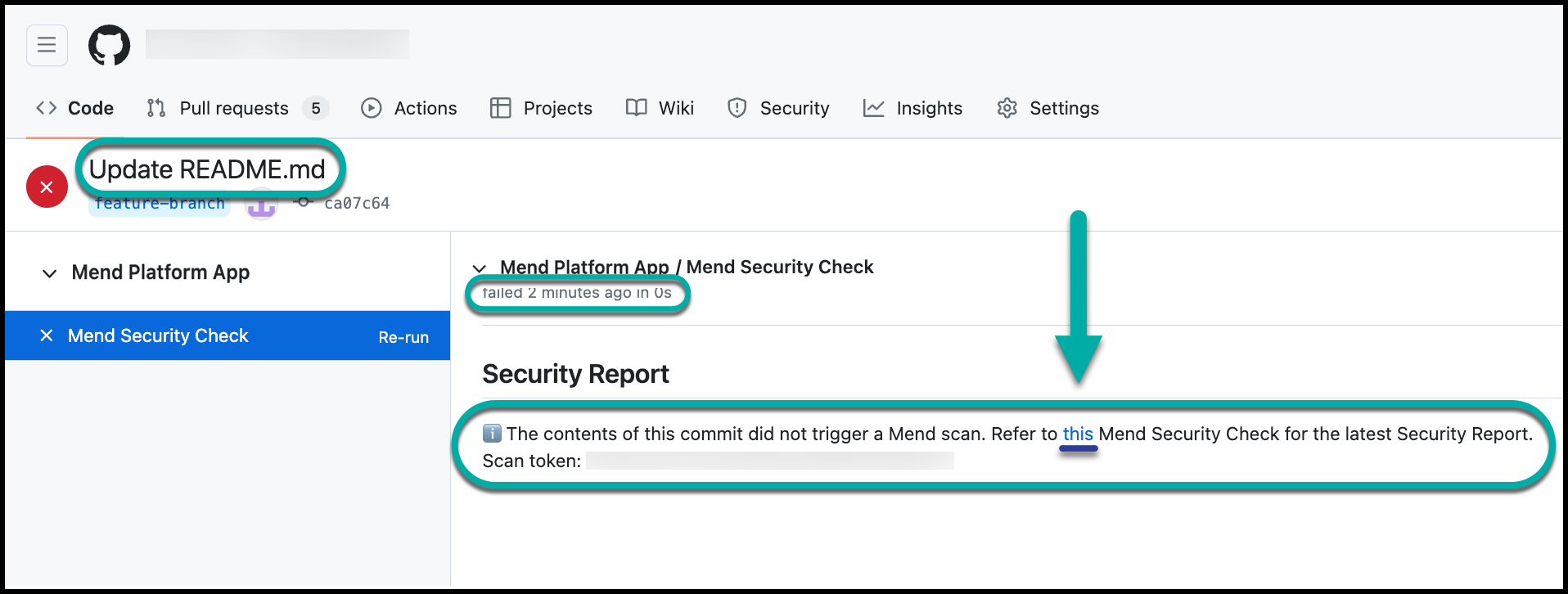 failure', all head commits that fail the scan due to the Mend Security Check display a 'failure' status. In this case, only the administrator of the repository can approve merging a pull request that includes this head commit to another branch in the repository, and therefore, it will not be automatically merged: