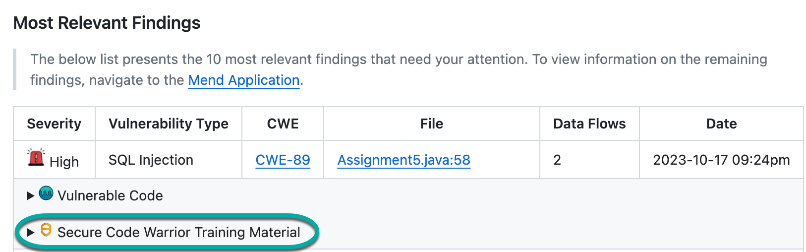 The Secure Code Warrior Training Material section can be found on both the Mend Code Security Check after a scan