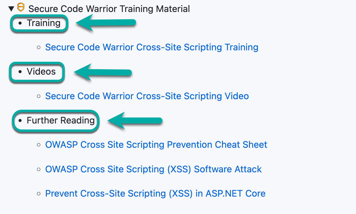 In case either a whole language or a certain finding is not supported, the Secure Code Warrior Training Material bullet will not be displayed. If training material is available, click on Secure Code Warrior Training Material to see the training resources available for each finding.