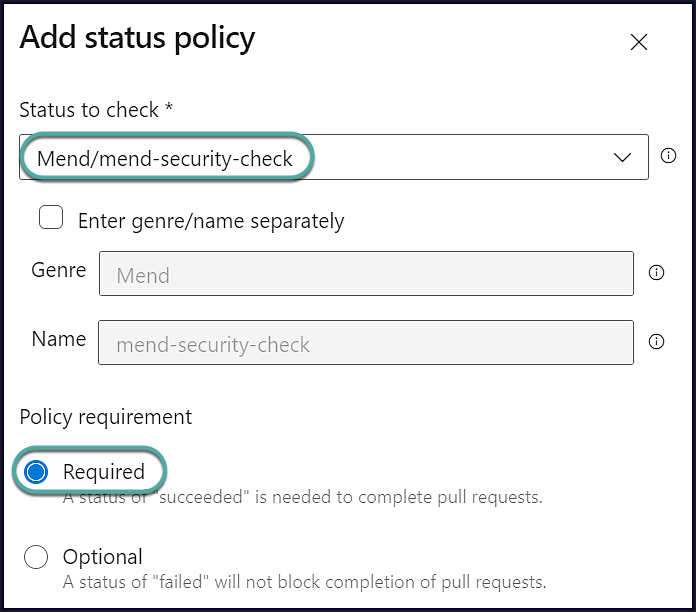 Create a branch policy in Azure Repos using Mend checks