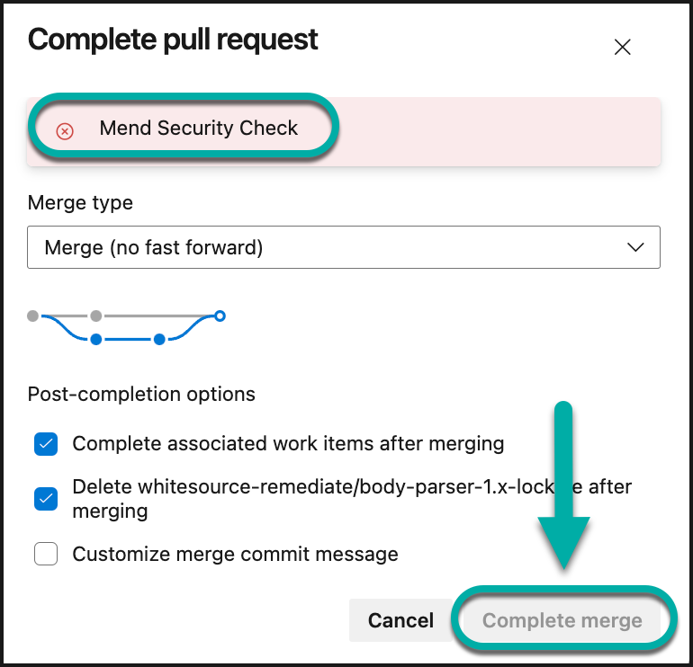 In collaboration with the default Mend configuration, failed Mend checks will block the associated pull request from being merged into your default branch, resulting in the Complete merge option being grayed out and not clickable: