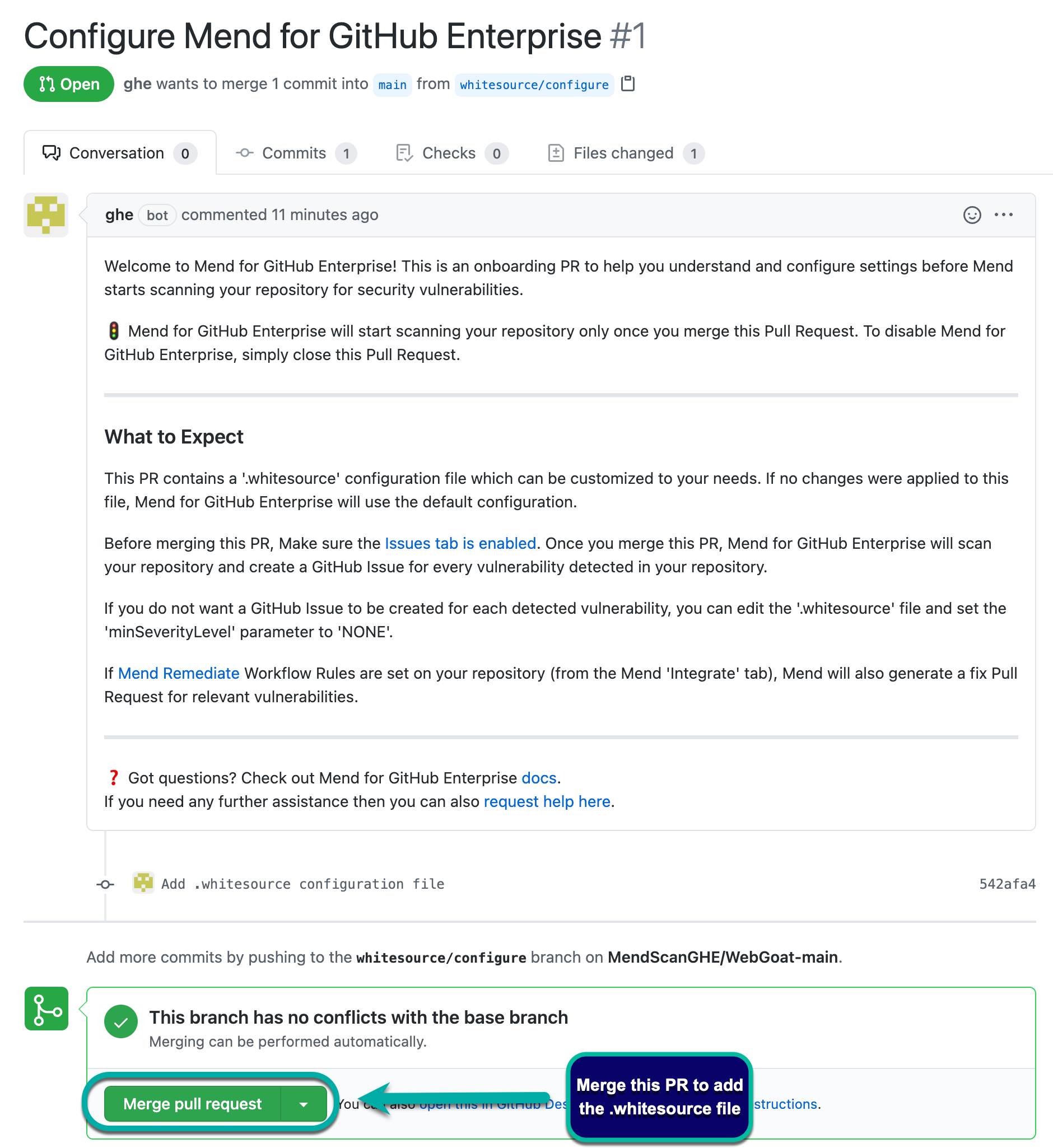 Once you have installed the Mend for GitHub Enterprise app, you will see a GitHub Pull Request (PR) appear in your integrated repositories. This is also referred to as the Mend for Enterprise “onboarding PR”: