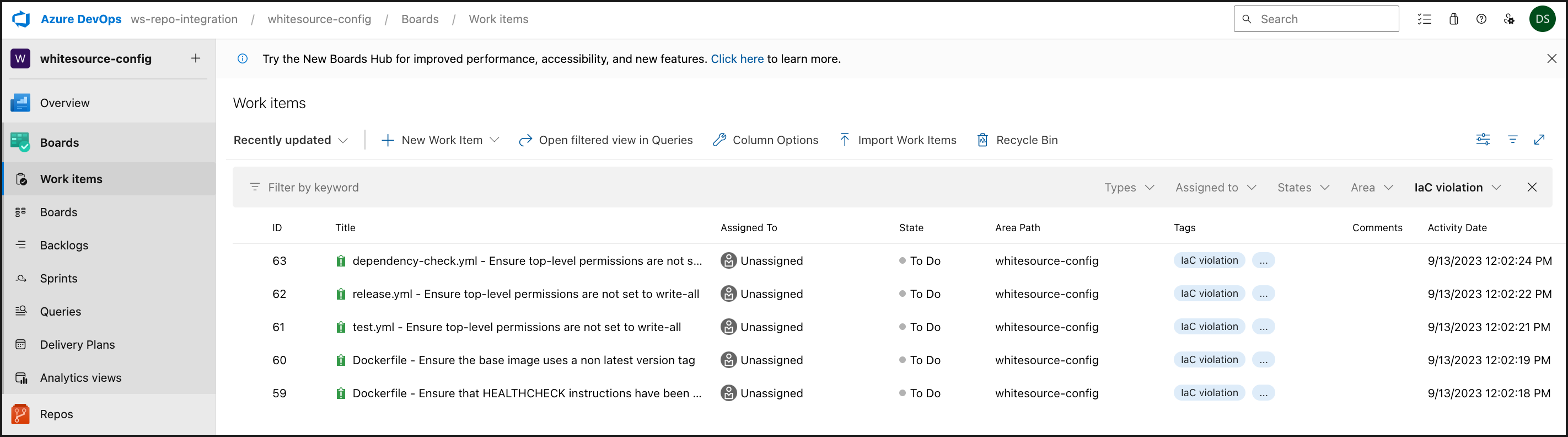 The Work Items section displays all the issues that Mend IaC Scan detected with the IaC Violation tag and a tag indicating a repository in which the issue was found. These proprietary labels indicate that a security vulnerability was detected by Mend.