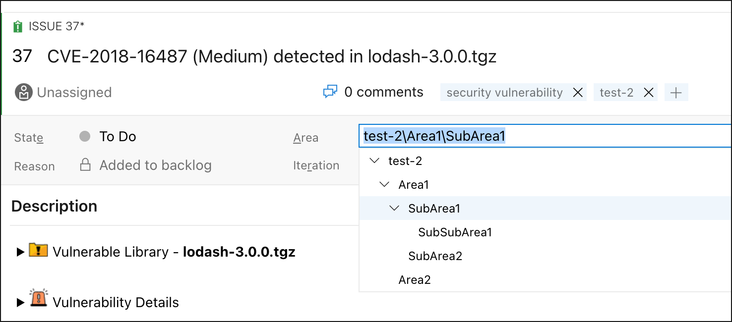 You can also create Area paths to group Work Items by team, product, or feature. This can be configured via the parameter customFields within the issueSettings configuration. Here’s an example of setting the area path: