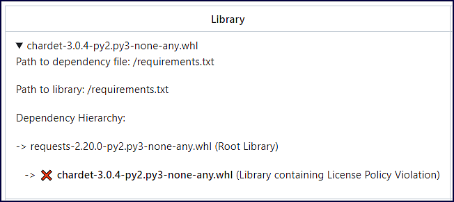 Library: Includes details of the library containing a license policy violation. It also includes the path to the dependency file and the path of the library. If the path is of a transitive dependency, then only the path information of the root library is displayed. This section also contains a commit link, which includes the path to the commit link where the license policy violation was found. NOTE: The originating branch of the license policy violation is also displayed in case the baseBranches configuration was used.
