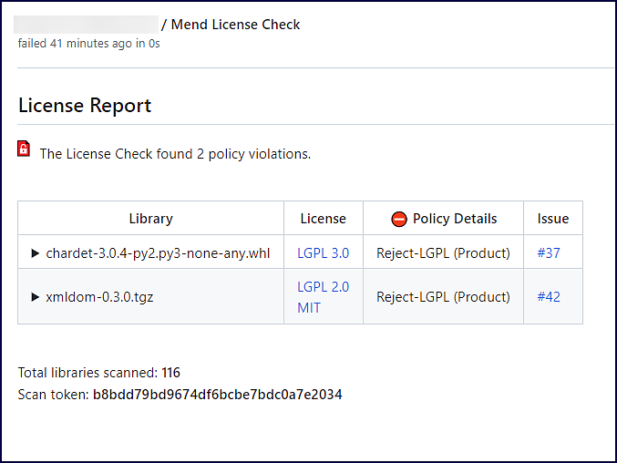 Once the Mend for GitHub Enterprise SCA scan is completed, the Mend checks are updated with the results. Both the Mend Security Check and the Mend License Check include a Scan token, which you can provide to Mend Support for troubleshooting.