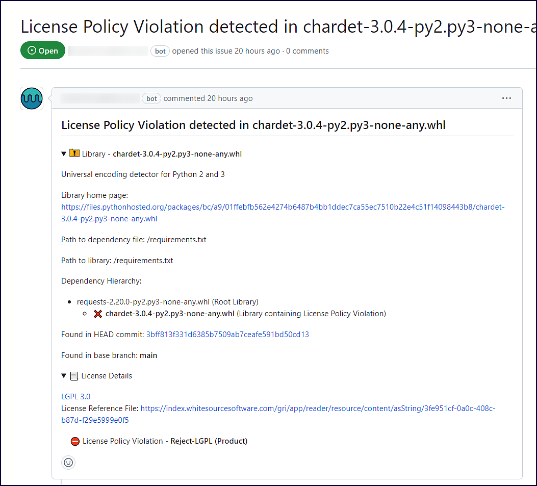 Note: If you have the license violation analysis enabled as part of your SCA scan, the integration will create a GitHub Issue for each violation finding. By default, each License Violation Issue is created with the “Mend: license policy violation” Issue label.