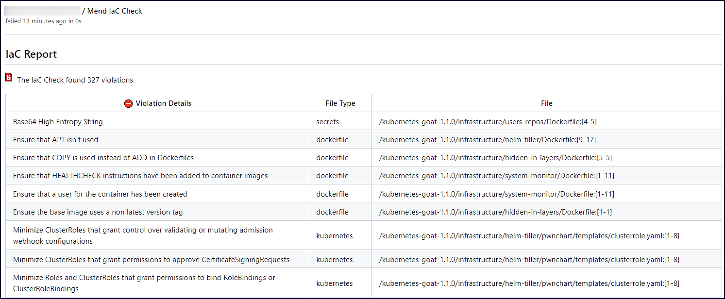 Once the Mend for GitHub Enterprise IaC scan is completed, the Mend IaC Check is updated with an IaC Report that provides an overview of the IaC violations found: