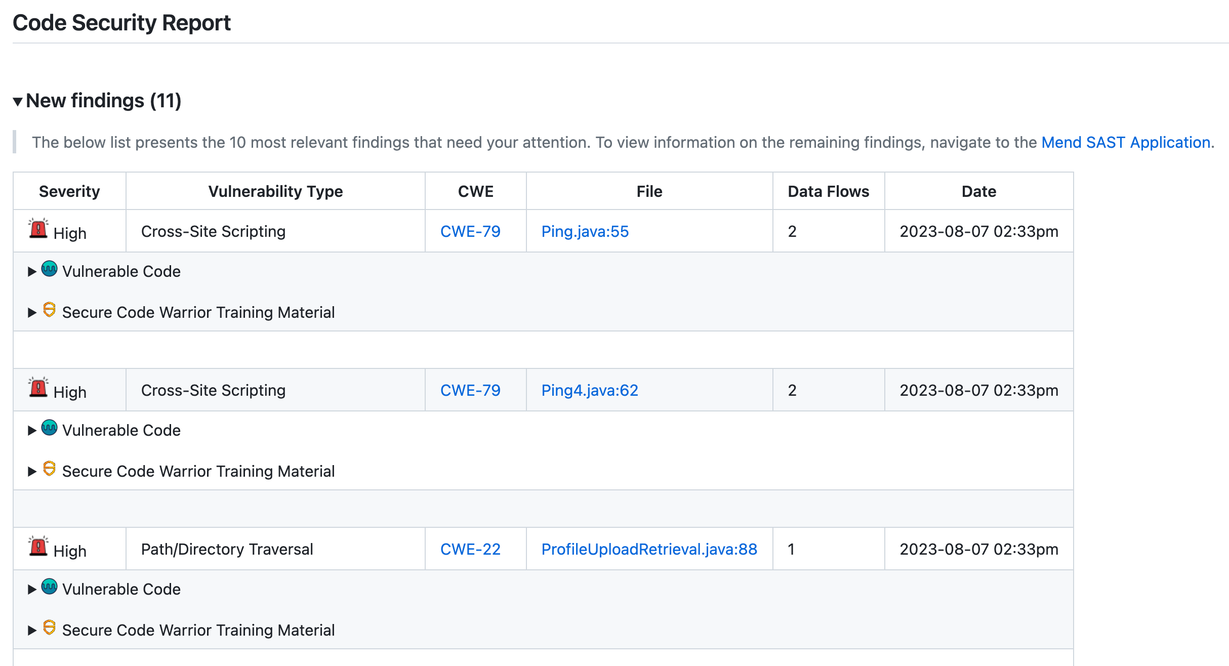 Once the Mend for GitLab SAST scan on the base branch is completed, the Mend Code Security Check creates a GitLab Issue titled “Code Security Report”. The Code Security Report shows the most relevant findings, regardless of when they are introduced: