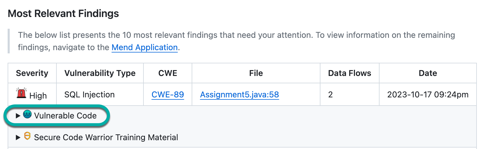 The Vulnerable Code section can be found on both the Mend Code Security Check after a scan