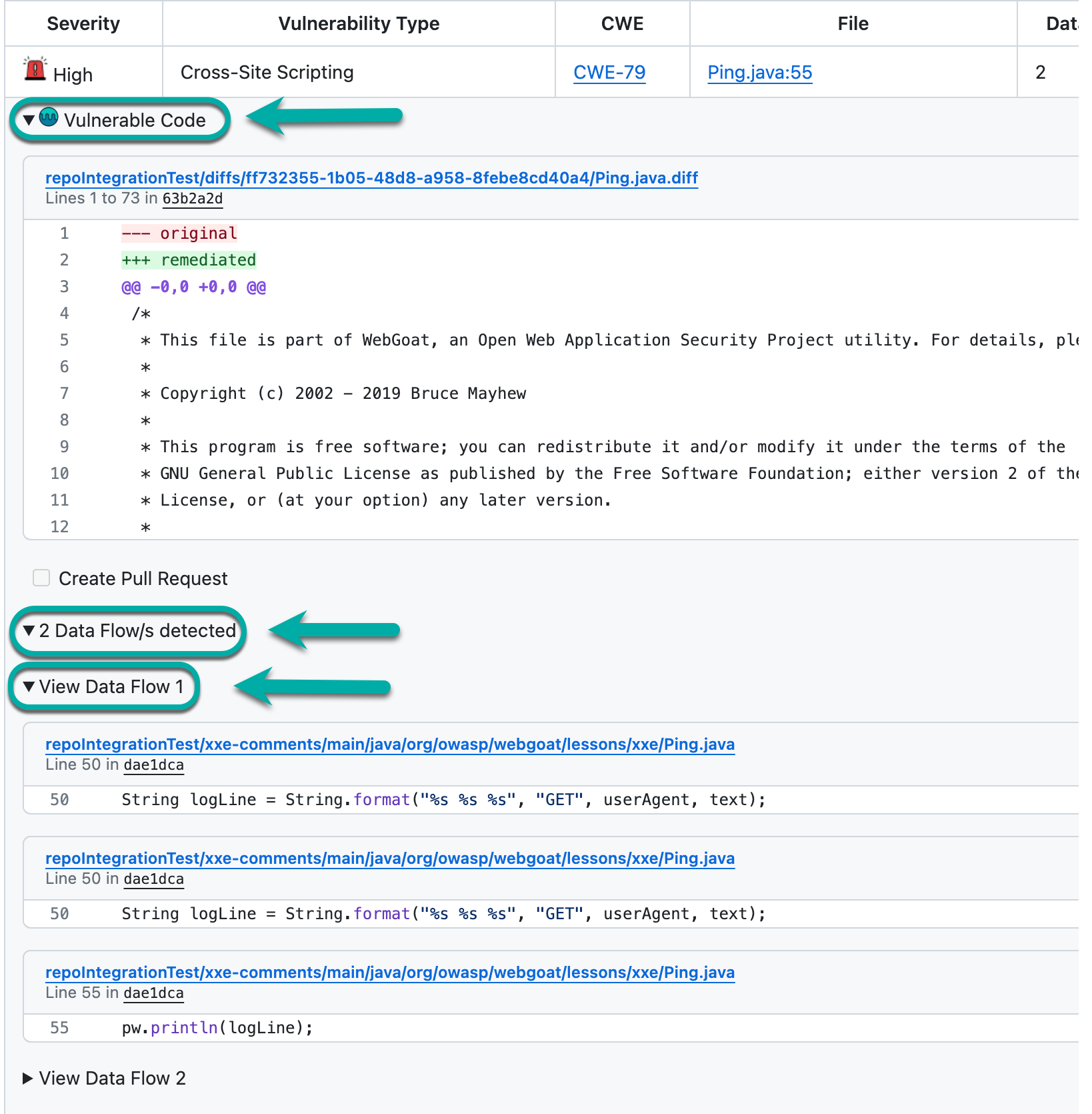 The Vulnerable Code section can expand for each CWE to see the code snippet in your project and the details of each vulnerability. This information will help you and your developers confront real findings within the code without ever leaving your GitHub environment.