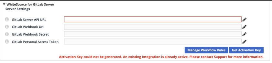 It means that you already created an Activation Key for one of the other Developer Integrations in this WhiteSource Organization. If we take the example above, the error is being displayed while attempting to setup GitLab Server Integration, which means that either BitBucket Server, GitHub.Com , or GitHub Enterprise has already been enabled on my Organization.
