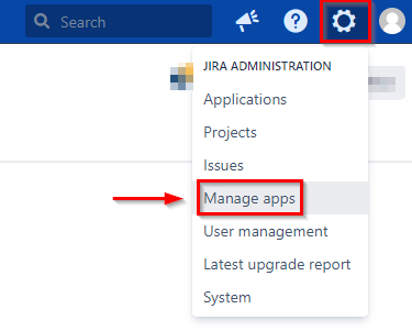 Once step one is completed, within Jira, navigate to the cog icon (settings button) and click on Manage apps: