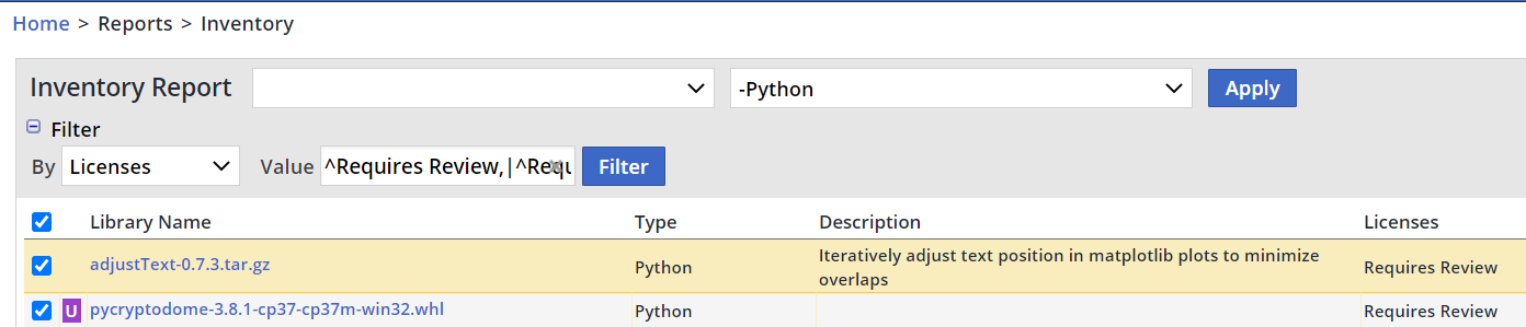 You can simply click the ‘Requires Review’ slice, which will automatically lead you to the project or product’s inventory report, adding a filter that lists only ‘Requires Review’ libraries.