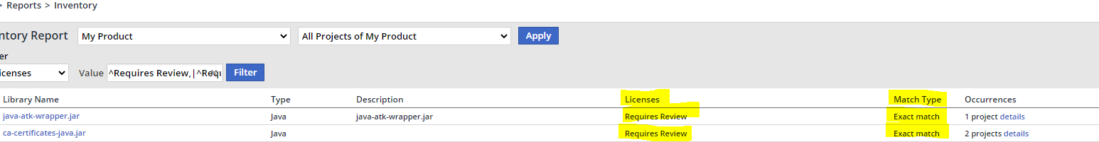 While checking the inventory report we often stumble upon ‘Exact Match’ libraries that are also in status ‘Requires Review’ as the associated license information is missing.
