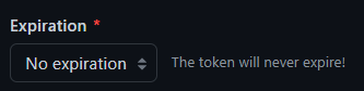 Expiration: The expiration date of the PAT. We recommend using whatever value works best for your organization. Keep in mind that, if you do place an expiration date on the PAT, our hostRules settings must be updated when it expires. In our example, we will use the No expiration option: