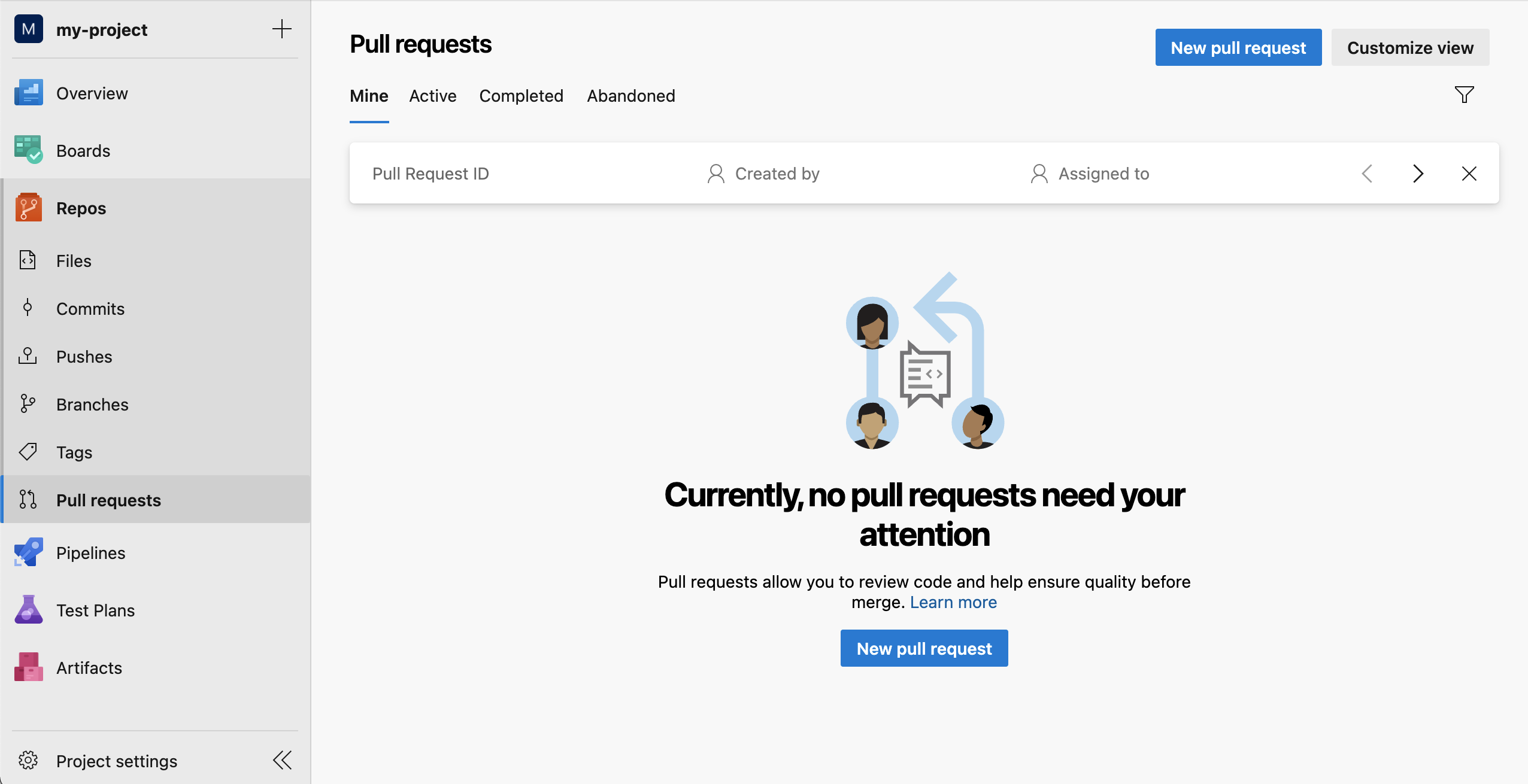 By default, when you open the Pull requests page in Azure Repos the “Mine” tab will be opened. This tab will show only those pull requests that were created by the logged-in user.