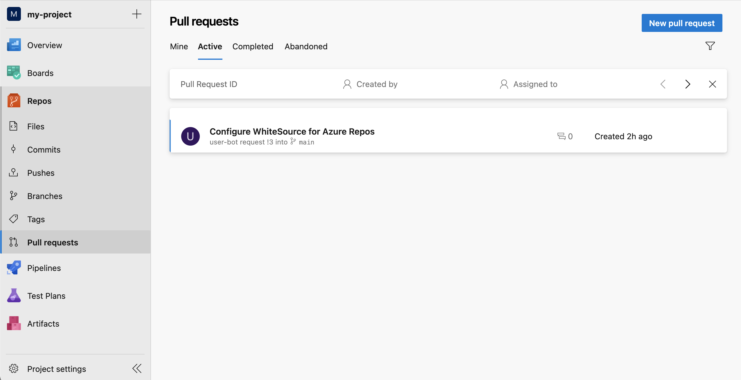 But if the integration relies on the bot-user’s PAT, all pull requests that Mend will create in the integrated repositories can be found in the “Active” tab.
