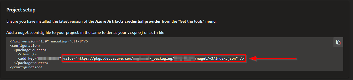 CODEhttps://pkgs.dev.azure.com/<AzureOrgName>/_packaging/<AzureFeedName>/nuget/v3/index.jsonIf your feed is Project-scoped, the URL will look something like this: