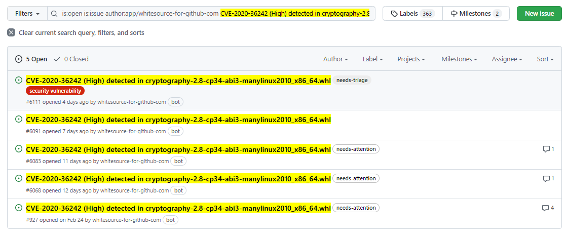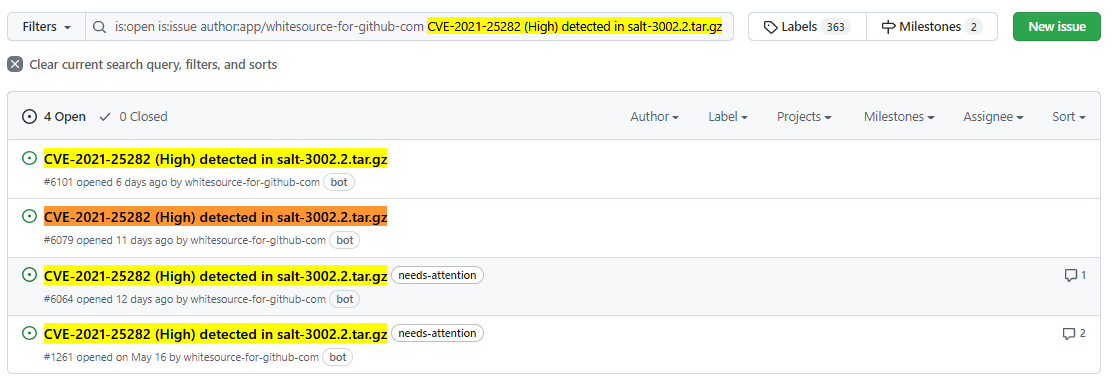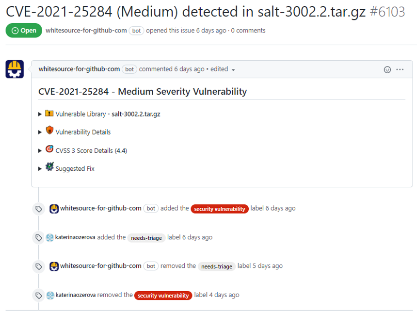 If you are using Developer Integrations and the creation of “Issue” is not disabled, then for every vulnerability, the Developer Integrations bot will create an “Issue” with a “security vulnerability” Label. If you find yourself in a situation where the Developer Integrations bot creates Issues for the same vulnerability on the same Library, as shown in the screenshot below: