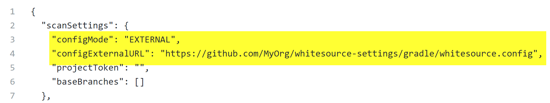 For example, teams that always have to run certain additional Gradle arguments to build their projects (gradle.additionalArguments needs to be used). In this case, you can set "configMode": "EXTERNAL" and "configExternalURL": "pointing to a whitesource.config file where "gradle.additionalArguments=-Pbranch=dev -PbuildWithSources=false" in the MyOrg/whitesource-config/gradle/repo-config.json