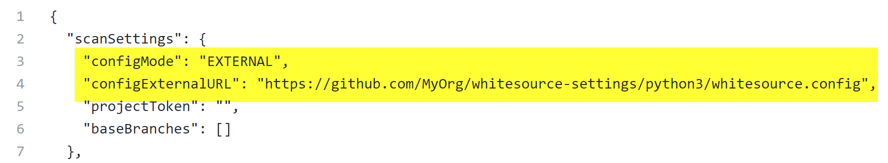 CODE{ "settingsInheritedFrom": "MyOrg/whitesource-config@python3" }