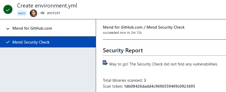 If the Mend server has finished processing the update request and no vulnerabilities were found, the check run status is set to “success”. Below is an example of a “successful” Mend Security Check on GitHub.com: