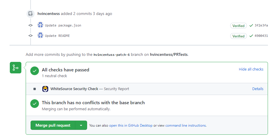 For example, in the below PR, package.json is updated (which is considered a valid push to initiate a Mend scan), then, README file is updated in the repository (which is not considered a valid push). This causes the Mend Security Check to appear as a neutral check on the pull request: