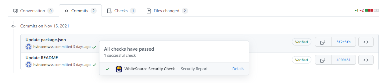 To view the details of the Mend Security Check that ran due to the valid push, navigate to the commit tab on the pull request. Then select the check mark or X next to the commit that contains the valid push to view the Security Report:
