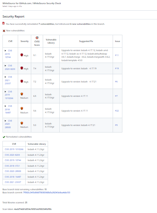 Below is an example of a Security Report for a pull request that upgraded the version of a vulnerable library. This pull request resolved seven vulnerabilities, but introduced six vulnerabilities as the new version of the library contains other vulnerabilities.