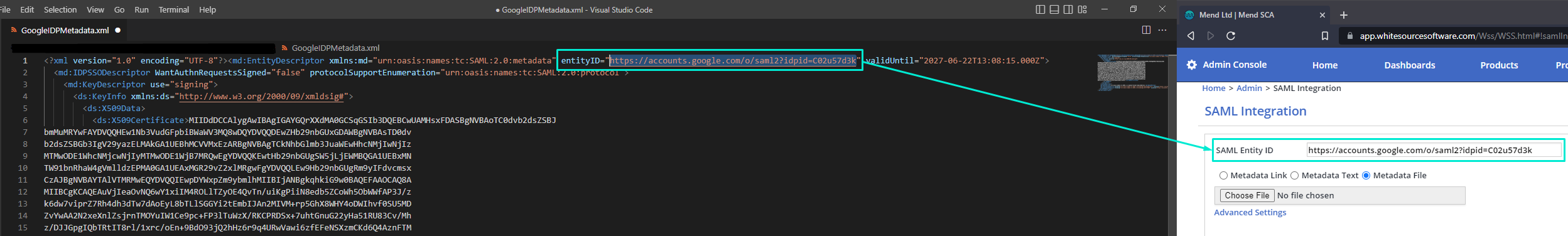 Fill in SAML Entity ID, this field can be taken from the metadata.xml file that was downloaded previously, namely → GoogleIDPMetadata.xml