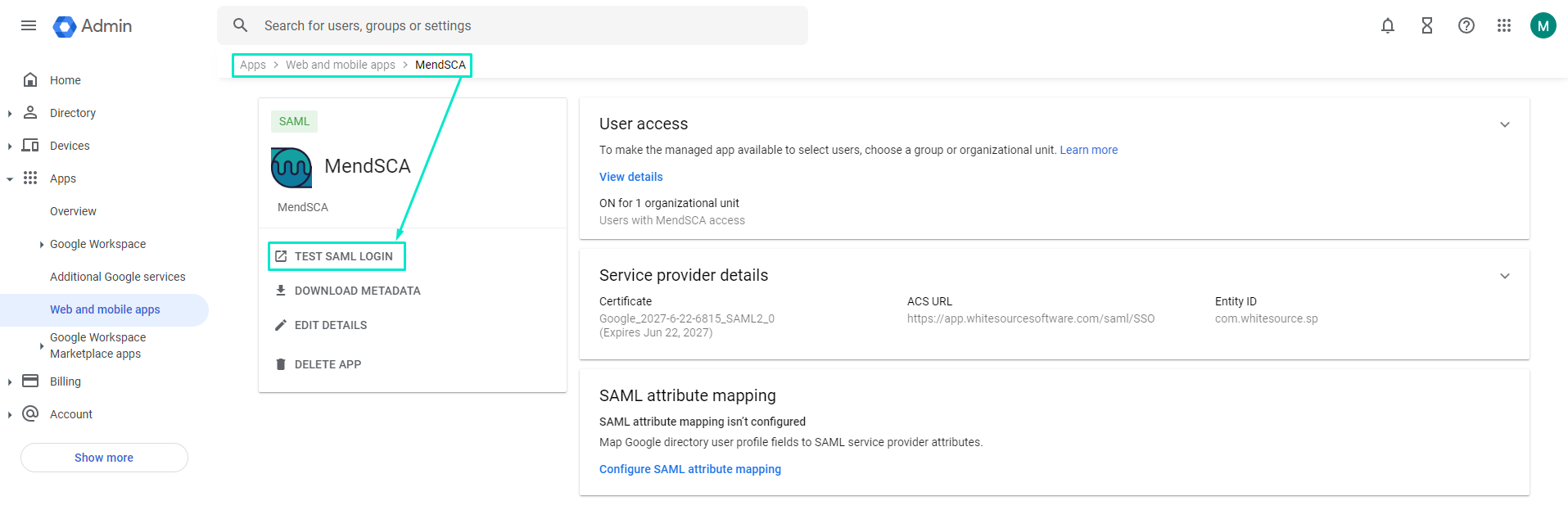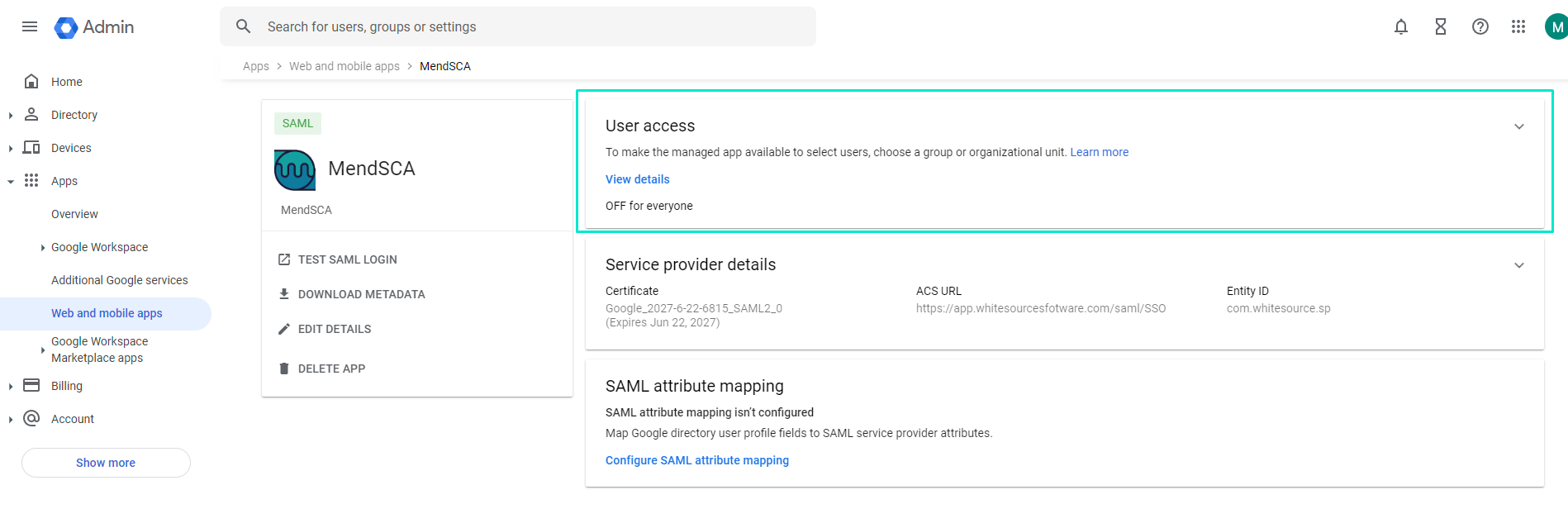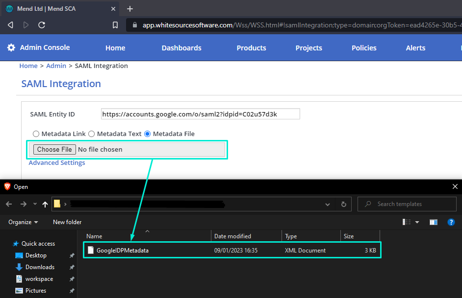 MendSCA supports SAML 2.0 integration for your organization. This article shows step-by-step how to implement this if your SAML 2.0 provider is Google Workspace.