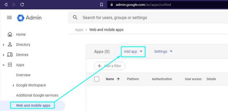 Navigate to Apps -> Web and mobile apps