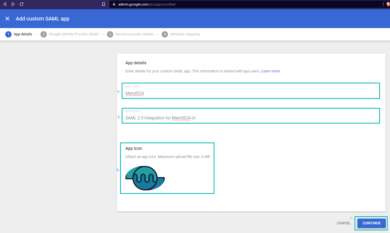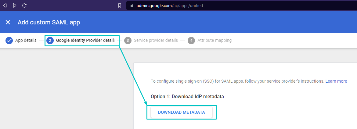 Under Option 1: Click 'DOWNLOAD METADATA' and save the file in an accessible location as it will be required in the following steps, then click 'CONTINUE'