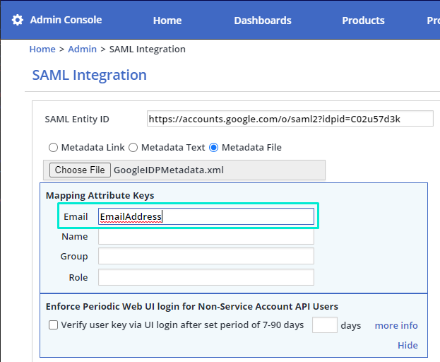 Under SAML Entity ID select the ‘Metadata file’ radio button and upload the metadata.xml file that was downloaded from GWS