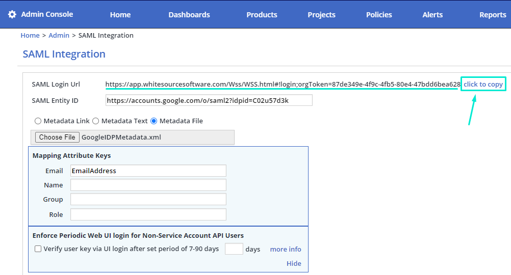 Note: The username\password login option will be available for 7 days once the SAML integration is saved in the MendSCA. After 7 days, this login option will be disabled, making SSO login required to access your Mend organization. If you want to extend this period or renew username\password access for a limited time, please contact Mend Support.