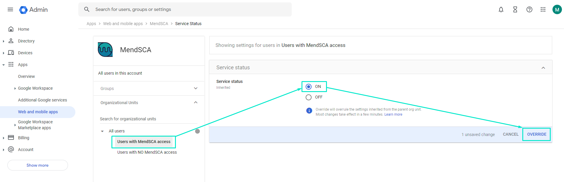 b. Select the Organizational Unit that should have access to MendSCA via SSO and select ‘ON’ under ‘Service Status’ and click ‘OVERRIDE’