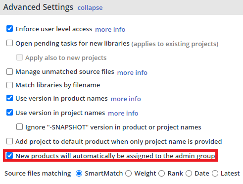 Mend Legacy SCA has a setting that will assign new products to the Organization Admin group. This allows for products created by a Mend Integration to not be accessed by users until the proper group is assigned later either manually or via API allowing for greater access control.
