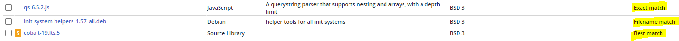 Best (Effort) Match - this type of match is encountered in the case of source libraries, as they are not populated by the application based on their SHA1, but rather based on a file matching algorithm.