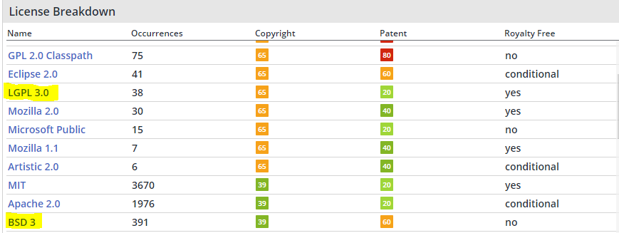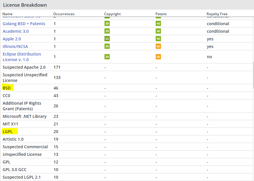 We can see that in this case, the licenses are missing information about the Patent, Copyright, and Royalty Fee. This is because, without a specific license version, a risk analysis cannot be further established.